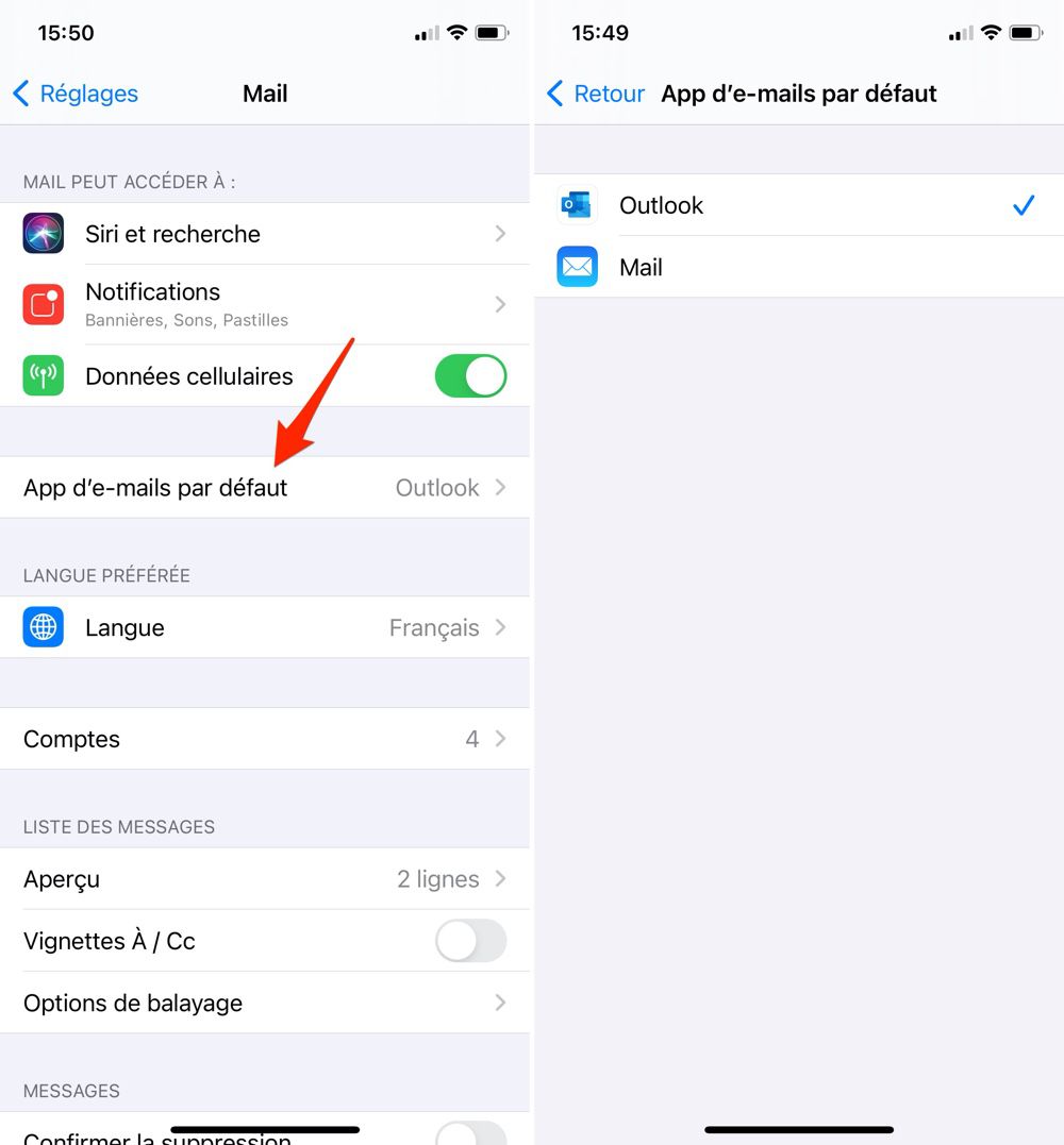 Faire d'Outlook l'application de messagerie par défaut pour IOS14